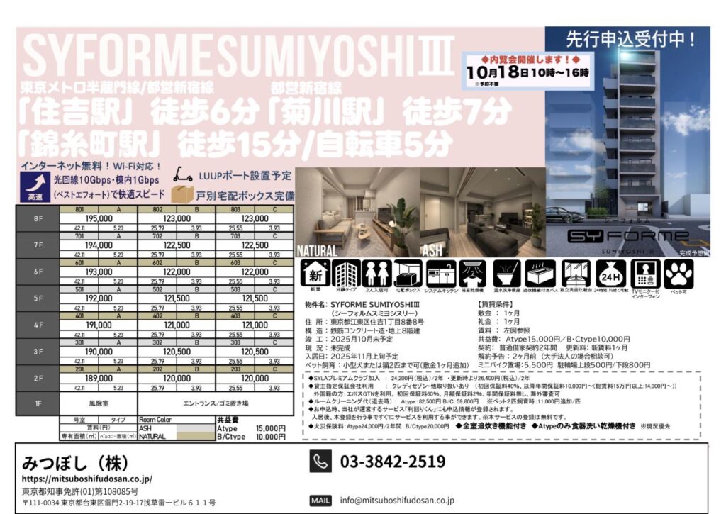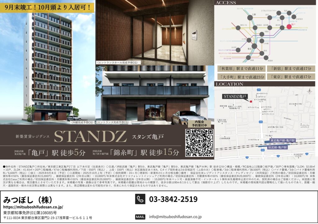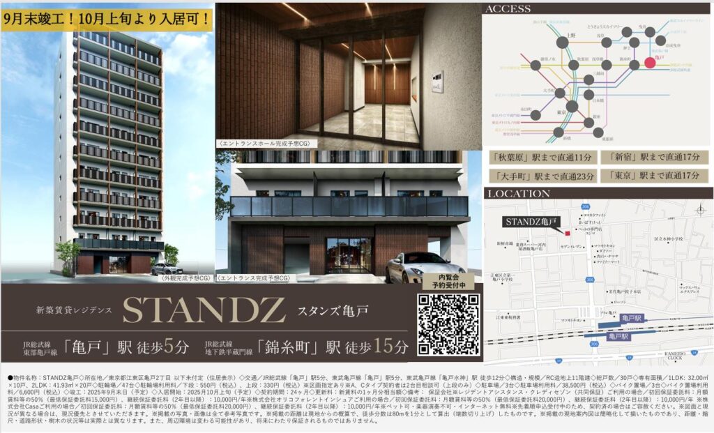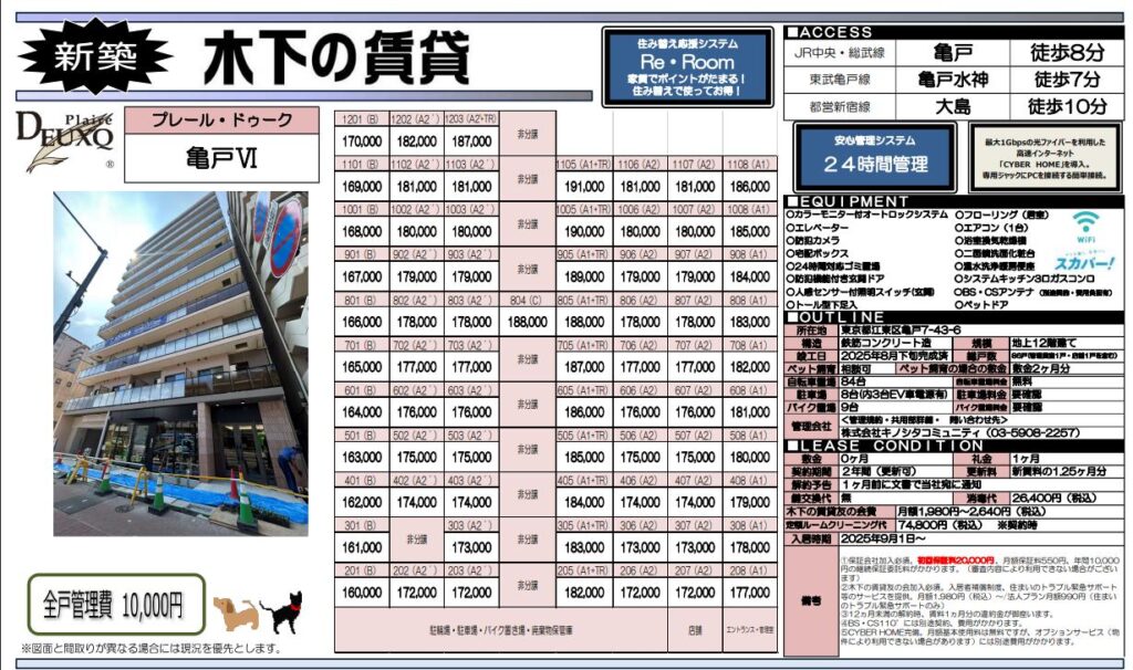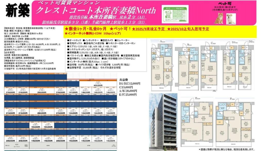 新築一棟図面9月~10月(一部掲載) 2025 09/27 Published 2025.09.27 / わたなべ \ この記事を共有 / B! リンクをコピーする 新築一棟図面9月~10月(一部掲載) わたなべ B! リンクをコピーする 先日募集が開始しました。完成前先行申込が可能の物件です。引っ越しシーズン1月からの物件探しを避けたい人からのお問い合わせが増えてきました。とはいえ動きが早い物件はすぐ申し込みが入るので繫忙期ほどではないですが「こんなに早くて1番手取れない日が続くのが本当にストレスです(でした)」という方が最近は多いかもしれません。不正とまではいかないですけど仲介会社が番手を抑えるためだけに、、、という申し込みもあるととある管理会社の人からも聞きました。なので1番手取れなかったから諦めますというよりは2番手以降も申し込みができる物件であれば申し込みしておくことをおススメいたします。 完成前先行申込が可能の物件です。1LDKはこの賃料でも動きが早いようですが、内覧してキャンセルになる住戸もでる可能性があります。新築賃料価格ですね。 10月上旬入居予定です。道路挟んだ向かいの建物も同じくらいの高さなので眺望はあまり期待できなさそうです。FtypeもLDKの造りは配置を少し考える必要がありそうです。 10月上旬入居予定です。エリアにもよりますが新築はどこも似たような賃貸条件ですね。 満室まではもう少し時間がかかりそうですね。 先日募集が出ました。一棟図面完成に少し時間がかかったようです。9月下旬入居予定。新築の間取り賃料は似たようなものが少なくないかもしれません。 亀戸が続きます。少し前に募集は開始していましたが、一棟図面が完成しました。北向き間取りは実際の部屋をご覧になって車の音が気になるかチェックしたほうが良いと思います。㎡も大事ですが、設備で判断したほうが良い気もします。北向きは洋室4.4畳ですが折れ戸クローゼットなので残りのスペースの広さがどのくらいか、4畳の洋室タイプはスライドなのでここはチェックしておくポイントになりそうです。 亀戸です。バランスの取れた街の1つです。1DK:Dは6畳くらい、縦長間取りなので家具の配置は思っている以上に狭いと感じる場合もあるので注意が必要です。横振り間取り、トイレが独立している点はポイント高いです。2LDK:ベッドは基本窓がある3畳の部屋に置くことになると思います。3畳あれば比較的大きめサイズもいけそう。ただ、大きすぎると他に何も置けないと思います。3畳は5㎡ないので、例えば、シングルベッド2つ併せて約4㎡(縦2m×横2m)とすると1㎡ないです。収納がある3畳はクローゼット開けたら「ベッドは・・・」になりそうなイメージかもしれません。