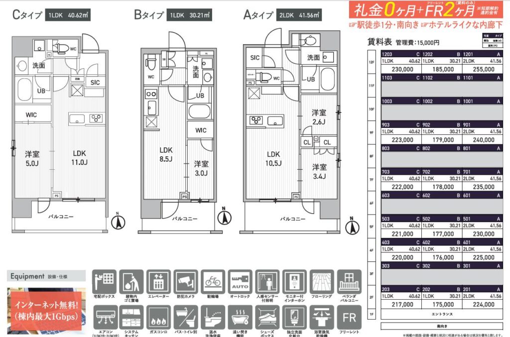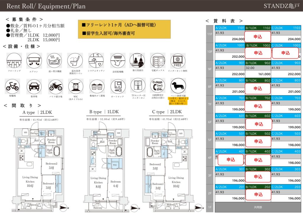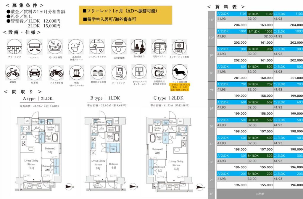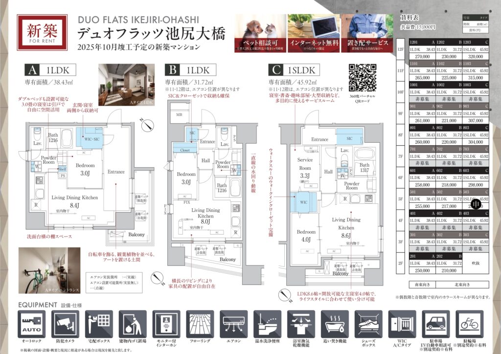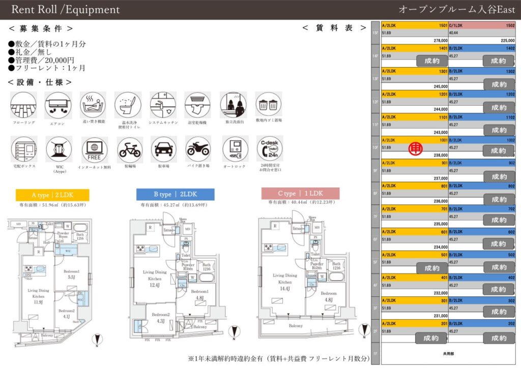 新築一棟図面9月~10月(一部掲載) 2025 09/27 Published 2025.09.27 / わたなべ \ この記事を共有 / B! リンクをコピーする 新築一棟図面9月~10月(一部掲載) わたなべ B! リンクをコピーする 先日募集が開始しました。完成前先行申込が可能の物件です。引っ越しシーズン1月からの物件探しを避けたい人からのお問い合わせが増えてきました。とはいえ動きが早い物件はすぐ申し込みが入るので繫忙期ほどではないですが「こんなに早くて1番手取れない日が続くのが本当にストレスです(でした)」という方が最近は多いかもしれません。不正とまではいかないですけど仲介会社が番手を抑えるためだけに、、、という申し込みもあるととある管理会社の人からも聞きました。なので1番手取れなかったから諦めますというよりは2番手以降も申し込みができる物件であれば申し込みしておくことをおススメいたします。 完成前先行申込が可能の物件です。1LDKはこの賃料でも動きが早いようですが、内覧してキャンセルになる住戸もでる可能性があります。新築賃料価格ですね。 10月上旬入居予定です。道路挟んだ向かいの建物も同じくらいの高さなので眺望はあまり期待できなさそうです。FtypeもLDKの造りは配置を少し考える必要がありそうです。 10月上旬入居予定です。エリアにもよりますが新築はどこも似たような賃貸条件ですね。 満室まではもう少し時間がかかりそうですね。 先日募集が出ました。一棟図面完成に少し時間がかかったようです。9月下旬入居予定。新築の間取り賃料は似たようなものが少なくないかもしれません。 亀戸が続きます。少し前に募集は開始していましたが、一棟図面が完成しました。北向き間取りは実際の部屋をご覧になって車の音が気になるかチェックしたほうが良いと思います。㎡も大事ですが、設備で判断したほうが良い気もします。北向きは洋室4.4畳ですが折れ戸クローゼットなので残りのスペースの広さがどのくらいか、4畳の洋室タイプはスライドなのでここはチェックしておくポイントになりそうです。 亀戸です。バランスの取れた街の1つです。1DK:Dは6畳くらい、縦長間取りなので家具の配置は思っている以上に狭いと感じる場合もあるので注意が必要です。横振り間取り、トイレが独立している点はポイント高いです。2LDK:ベッドは基本窓がある3畳の部屋に置くことになると思います。3畳あれば比較的大きめサイズもいけそう。ただ、大きすぎると他に何も置けないと思います。3畳は5㎡ないので、例えば、シングルベッド2つ併せて約4㎡(縦2m×横2m)とすると1㎡ないです。収納がある3畳はクローゼット開けたら「ベッドは・・・」になりそうなイメージかもしれません。