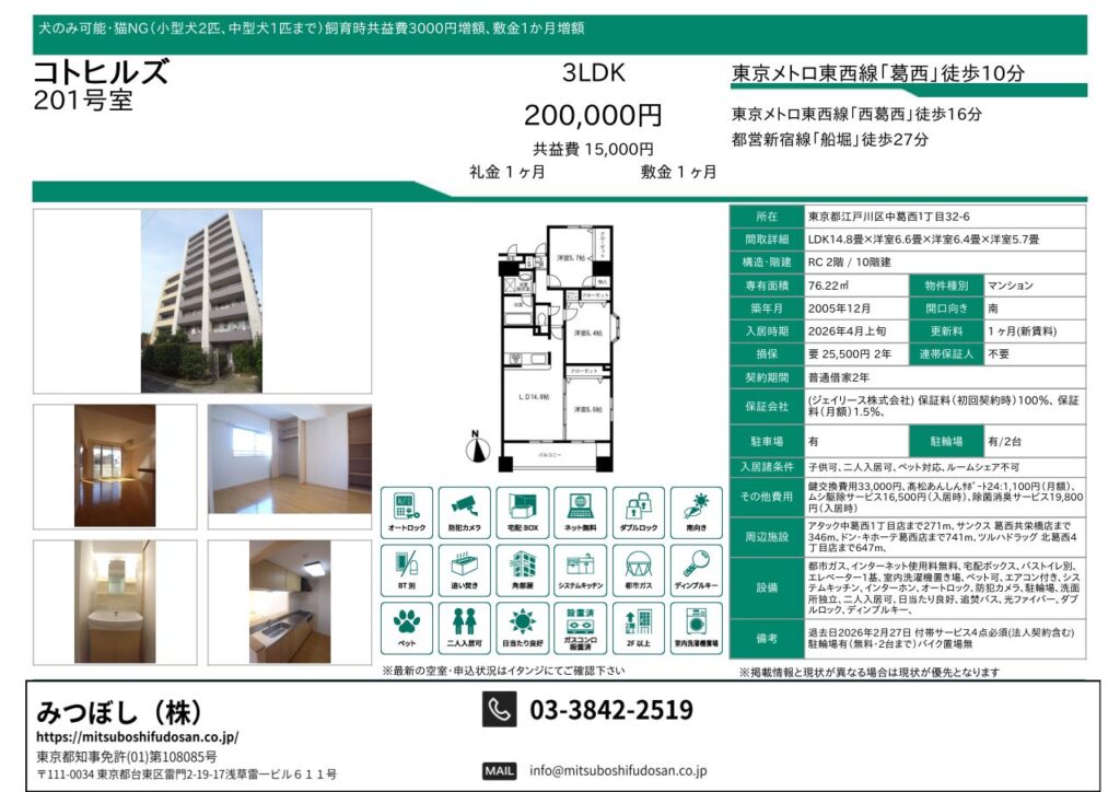 4月上旬入居予定、2月28日から内覧開始予定。退去前は先行申し込みが可能の物件です。1番手のみ申し込み可能です。最近は5月入社もOKな企業も増えていたりと4月入居物件も動きがありますね。夜遅い時間に募集が開始する物件もあります。ポータルに情報が出るのはおそらく次の日の朝。既にやりとりしている人がいれば夜には申し込みが入るので、夜遅くても不動産会社と連絡がとれる状態にしておくというのも1つです。ちなみにこちらの住戸は22時30頃募集開始しました。弊社でも繁忙期に関係なく物件探している人は23時くらいまでは普通にLINEやメッセンジャーなどで連絡がくるのでそのくらいみんな必死で探しているんだというのも知っておくのは良いと思います。仕事終わって落ち着くのがその暗いからという人も少なくないです。